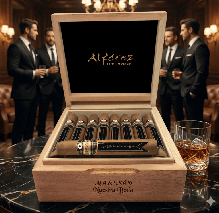 Nuestra elegante caja viene grabada en láser con los nombres de los novios e incluye 24 puros premium. Para darle ese toque visual único, cada puro cuenta con un listón 100% personalizado. ¡Un regalo lleno de clase y buen gusto para compartir con quienes más quieres!