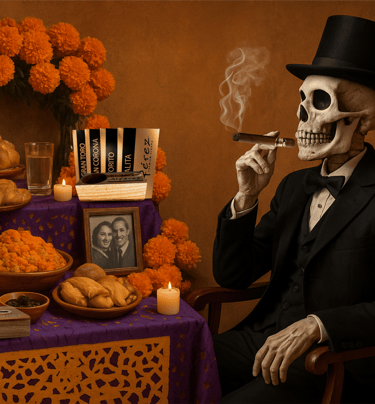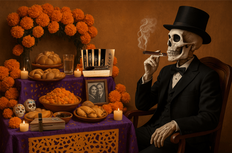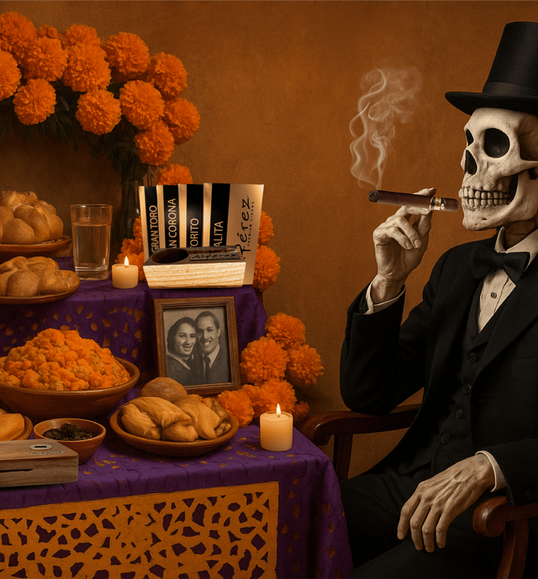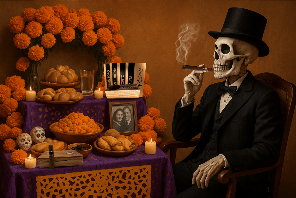 Los puros son parte de la tradición del Día de Muertos como una ofrenda personal y un símbolo de los placeres o gustos del difunto. Se colocan en las ofrendas junto a otros elementos como fotografías, comida favorita, velas, flor de cempasúchil, pan de muerto y objetos que recuerdan al ser querido, representando un tributo personal y la conexión del mundo terrenal con el espiritual.