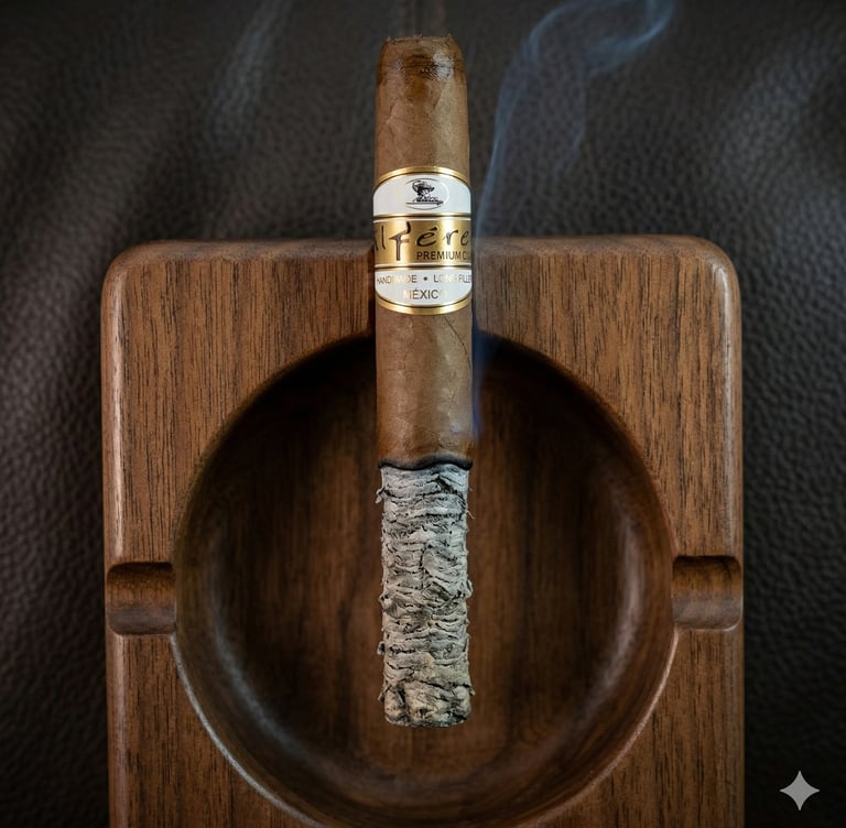 El arte de dejar ir: Deja que la ceniza crezca aproximadamente entre 2 y 3 centímetros. Cuando veas que la gravedad empieza a hacer su trabajo o se forme una pequeña grieta, no la golpees. Simplemente apoya suavemente el pie del puro contra el fondo del cenicero y gíralo con ligereza para que la ceniza se desprenda de forma natural y elegante